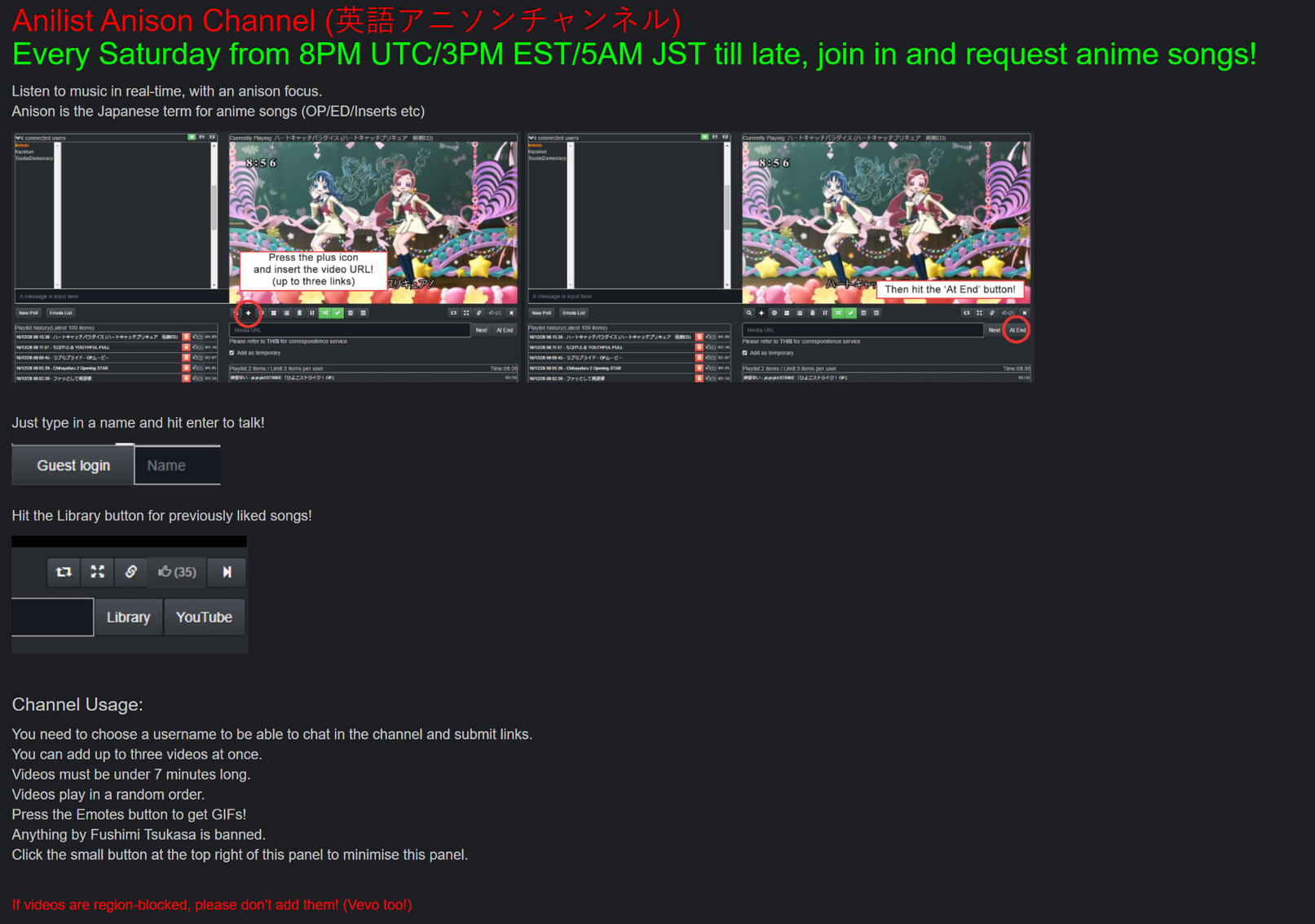 Anison is an event on AniList where we meet and listen to music on Saturdays at 9pm UTC. We use CyTube to listen to the same music at the same time and talk on Discord.